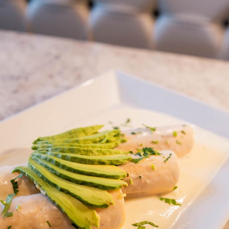 Two fried chicken taquitos topped with cheese sauce. Served with guacamole salad and rice.